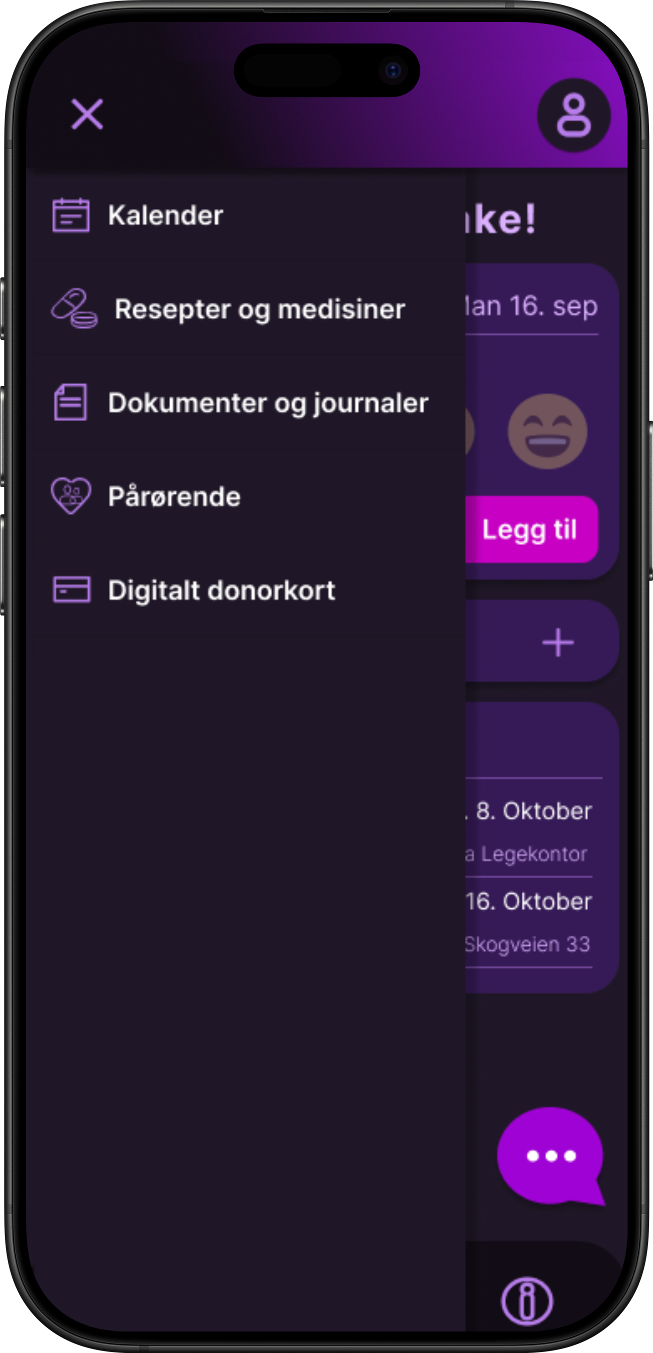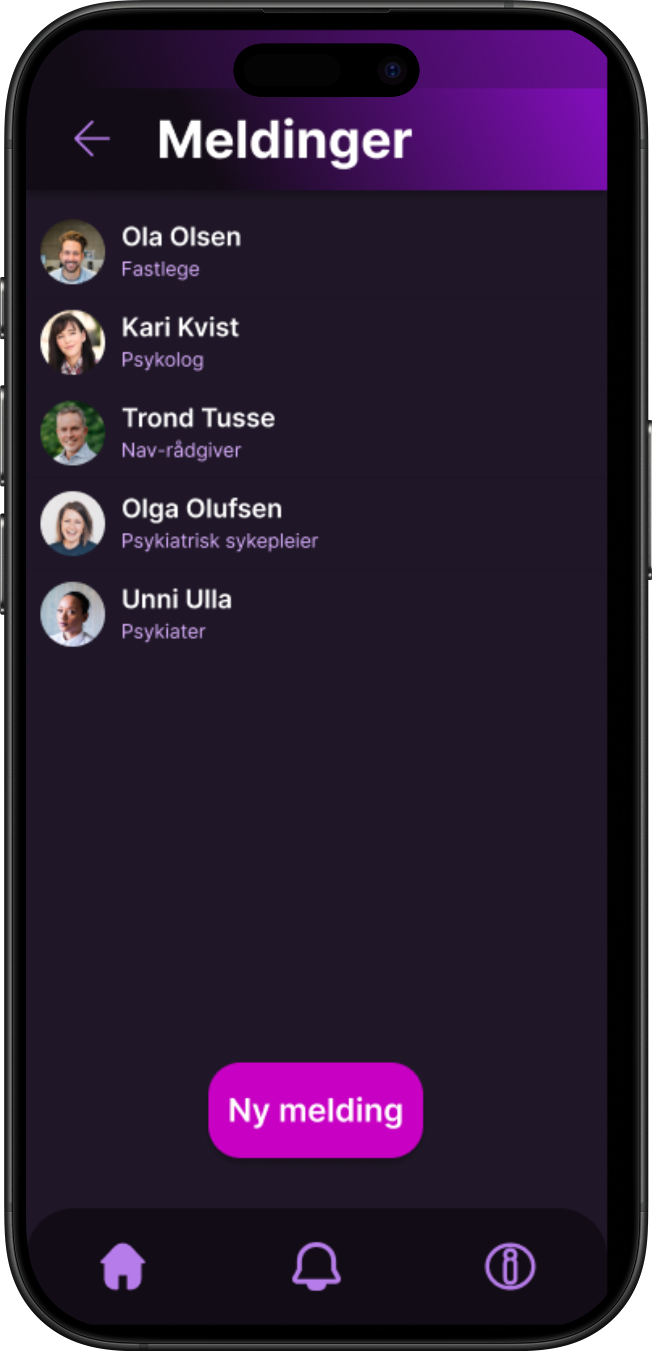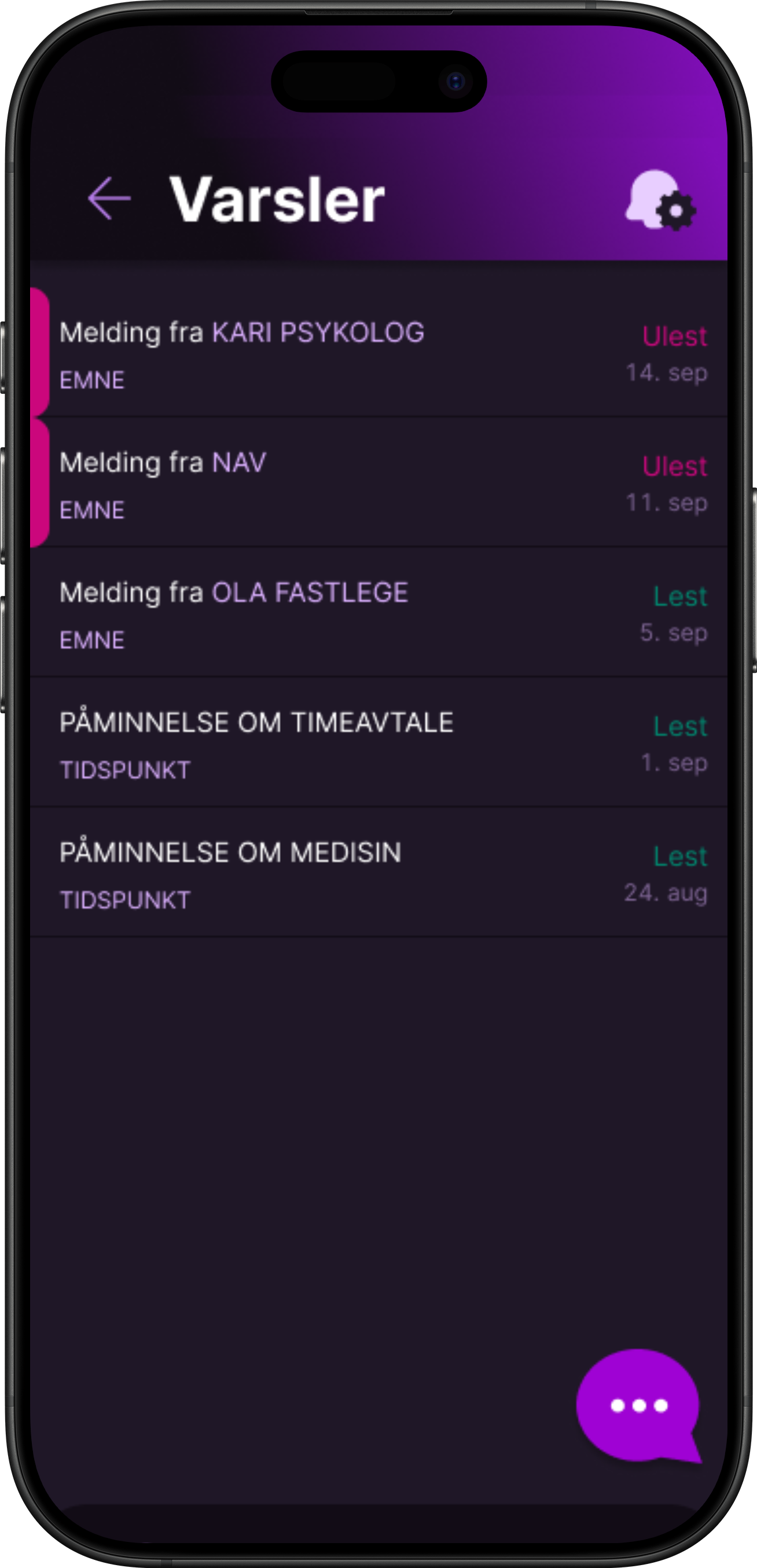 Mørkt tema, lilla/rolige toner → lav stressfaktor, moderne uttrykk