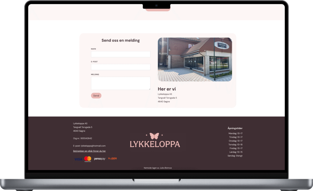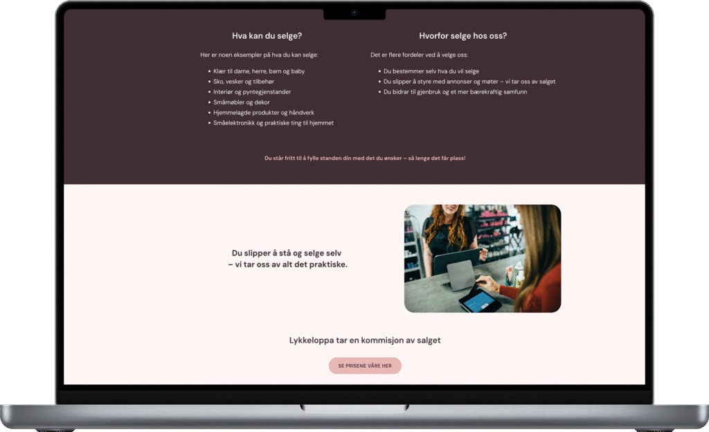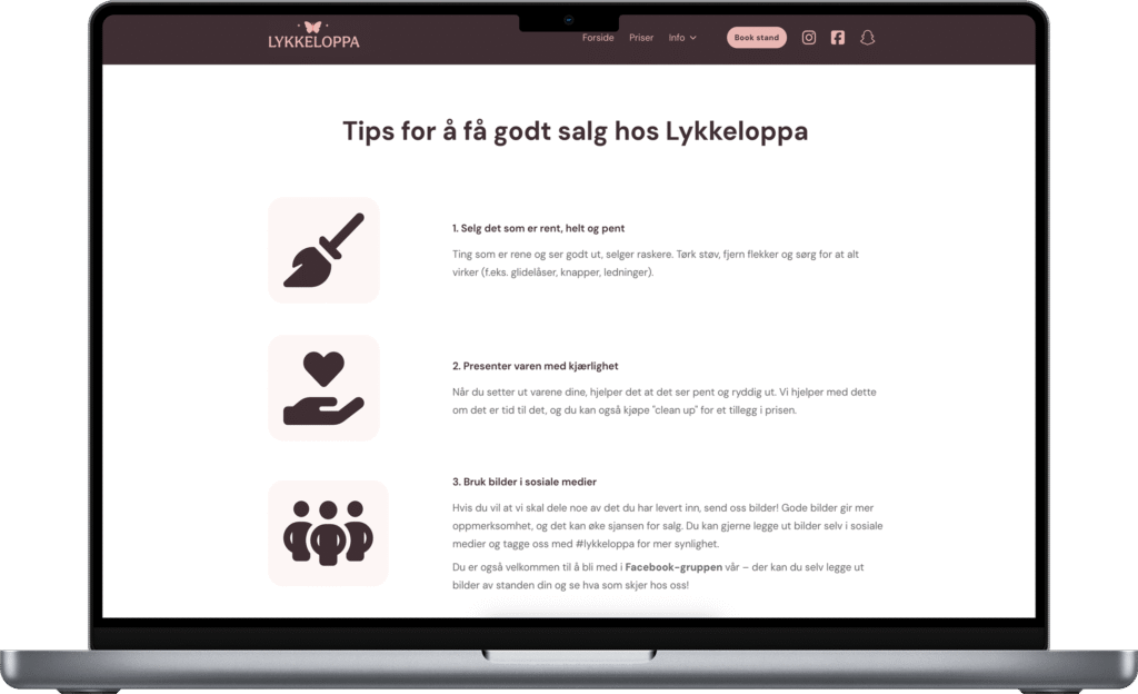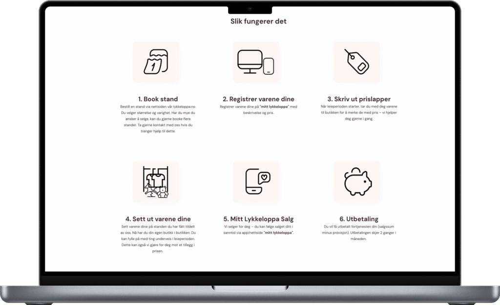 Lykkeloppa trengte en digital plattform som både speiler deres lekne og profesjonelle identitet og gjør det enkelt for kunder å forstå konseptet. Løsningen ble en minimalistisk, mobilvennlig nettside med tydelig struktur, inspirert av loppeliten.no, men tilpasset Lykkeloppas egen profil.